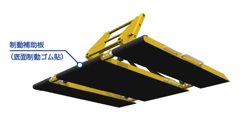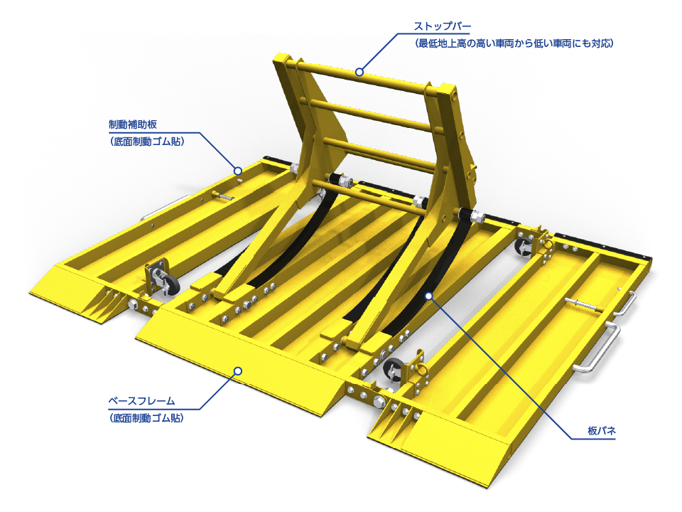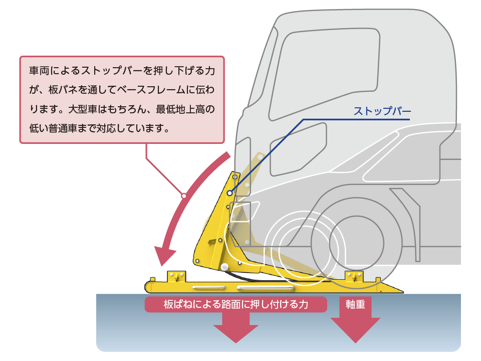車両軸重に加えてストップバーから伝えられたバネ力を本体ベースフレームから路面に伝達し、装置底面に貼付された制動ゴムの摩擦抵抗によって車両を停止させます。ストップバーが、シャシー下部と接触することで沈み込むため、車両のジャンピングも抑制しています。