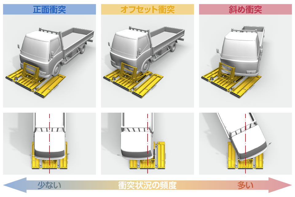 衝突時、車両停止装置に偏心力がかかると車両停止装置自体が回転してしまい、作業員を巻き込む事故になる可能性が高くなります。「規制の横綱」は底板面積を大きくすることで、どの角度から車両が衝突しても偏心力がかかりにくい構造となっており、車両停止装置が回転、離脱しにくい特性を持ち、作業員の命を守る車両停止装置となっています。