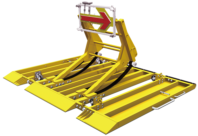 底板面積を大きくすることは斜めからの進入車両に対して大きなメリットがある反面、底板面積拡大によりトラックに積み込みできないサイズとなってしまうデメリットがありました。「規制の横綱」は、底板の両端部分を折りたたむ構造とすることで運搬時は底板面積を小さくし、使用時には底板面積の拡大といった二つのケースに対応しています。